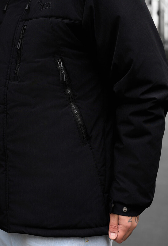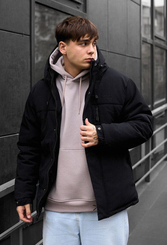 - висока горловина переходить у капюшон, об'єм якого допомагають регулювати шнури з пластиковими фіксаторами;
