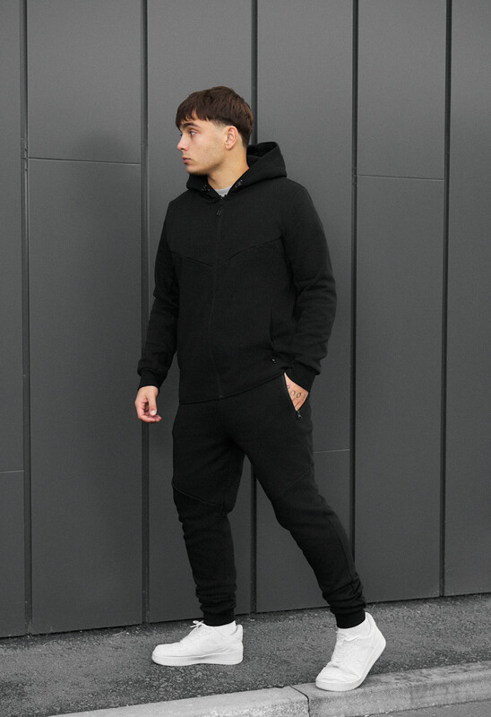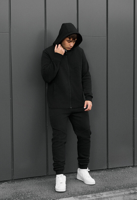 Однотонный черный костюм — воплощение минимализма и уверенного стиля. Мягкий микрофлис надежно сохраняет тепло, обеспечивая комфорт даже в холодную погоду. Классический крой подчеркивает фигуру, не стесняя движений, а регулируемый капюшон и манжеты на резинке добавляют практичности. Эластичный пояс и удобные карманы делают комплект идеальным для повседневных прогулок или активного отдыха. Черный цвет придает образу строгую элегантность и универсальность, легко сочетаясь с любой обувью и аксессуарами.