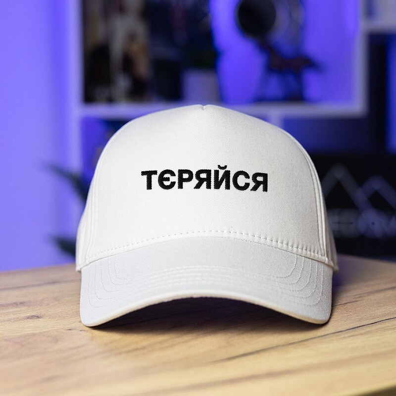 • Белая бейсболка Pobedov с вышитой надписью "Тєряйся"