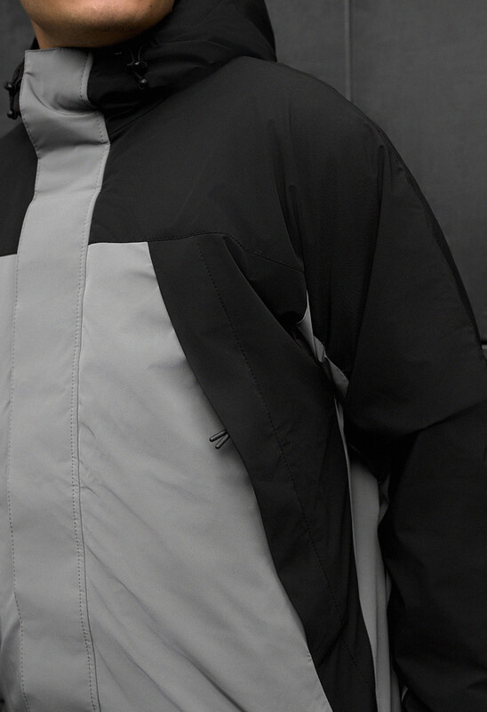 - Высокая горловина переходит в капюшон, ширина которого регулируется эластичной стяжкой с пластиковыми фиксаторами;