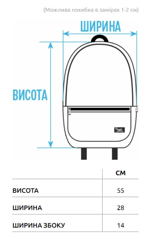 - розмір: висота 56 см, ширина 28 см, ширина збоку 14 см;