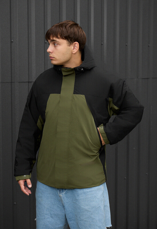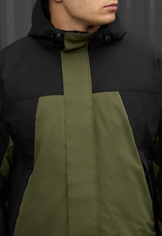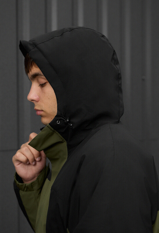- Высокая горловина переходит в капюшон, ширина которого регулируется эластичной стяжкой с пластиковыми фиксаторами;