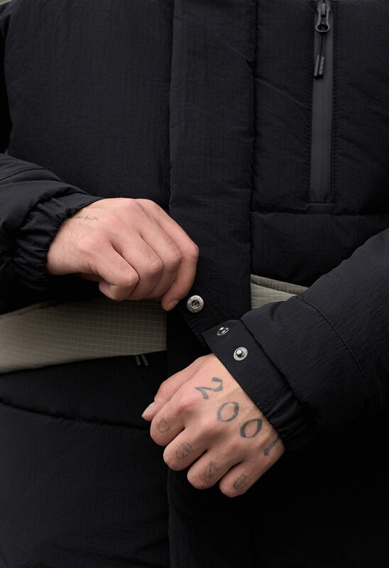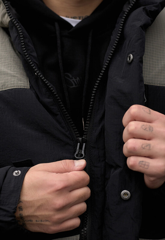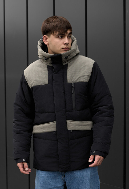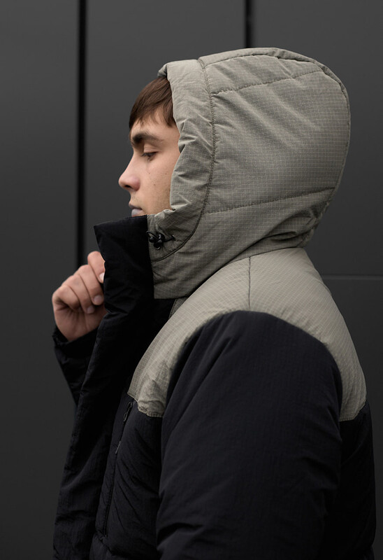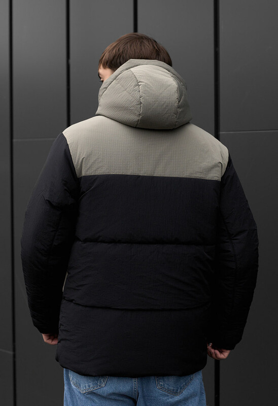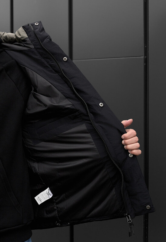 - висока горловина переходить у капюшон, об'єм якого допомагають регулювати шнури з пластиковими фіксаторами;