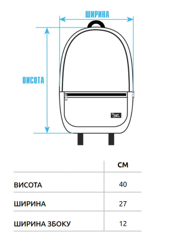 - розмір: висота 40 см, ширина 27 см, ширина збоку 12 см;