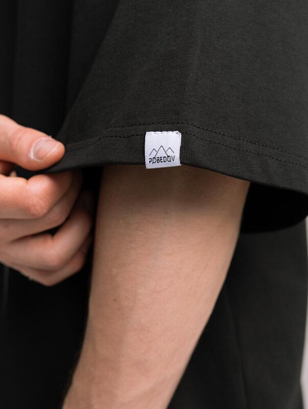 Небольшая жаккардовая бирка Pobedov на левом рукаве добавляет фирменный штрих, подчеркивая качество материалов и стиль бренда.