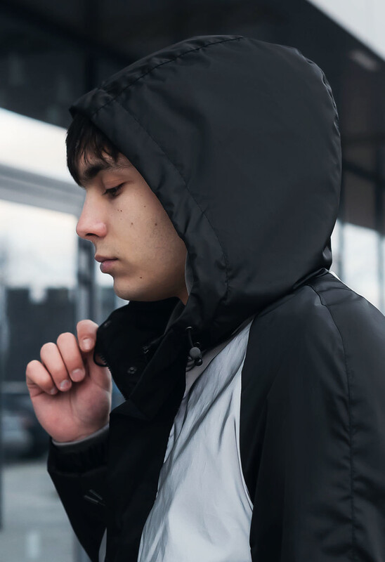 - висока горловина переходить у капюшон, ширина якого регулюється еластичною стяжкою із пластиковими фіксаторами;