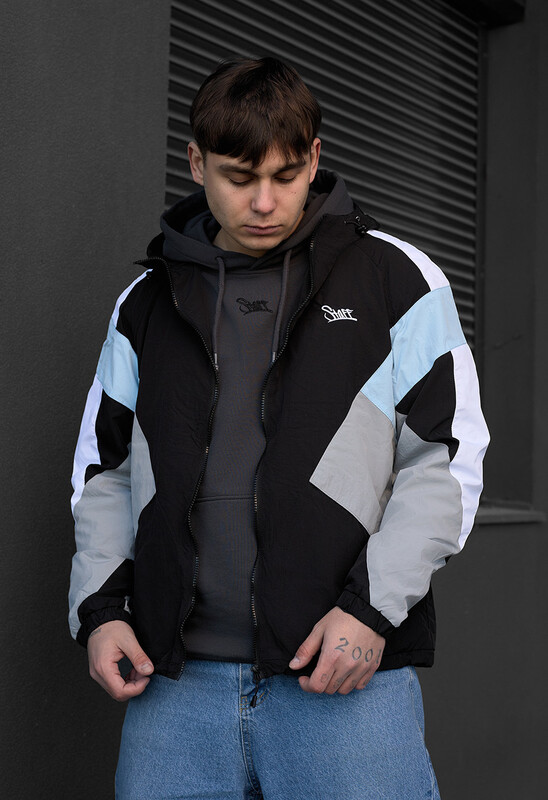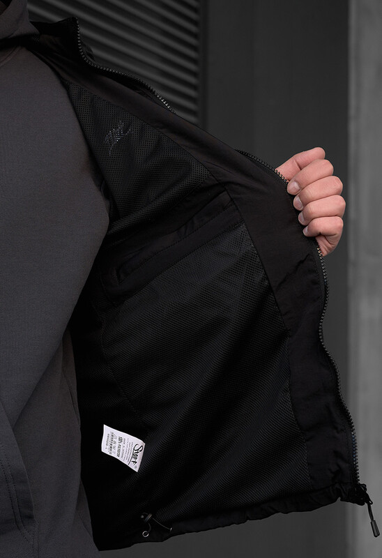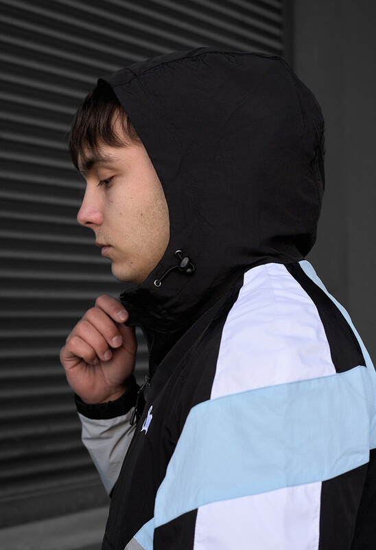- высокая горловина переходит в капюшон, ширина которого регулируется эластичной стяжкой с пластиковыми фиксаторами;