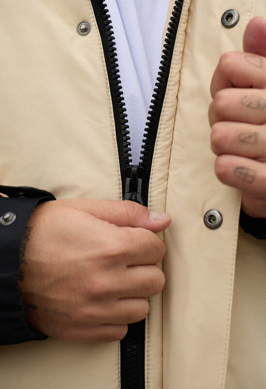 - Высокая горловина переходит в капюшон, объем которого помогают регулировать шнуры с пластиковыми фиксаторами;
