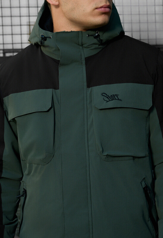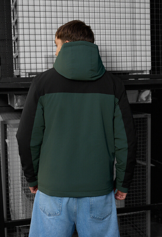 - Высокая горловина переходит в капюшон, объем которого помогают регулировать шнуры с пластиковыми фиксаторами;