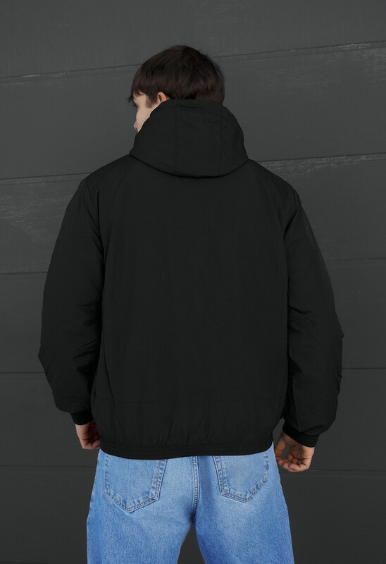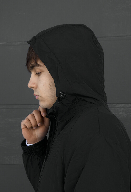 - Высокая горловина переходит в капюшон, объем которого помогают регулировать шнуры с пластиковыми фиксаторами;