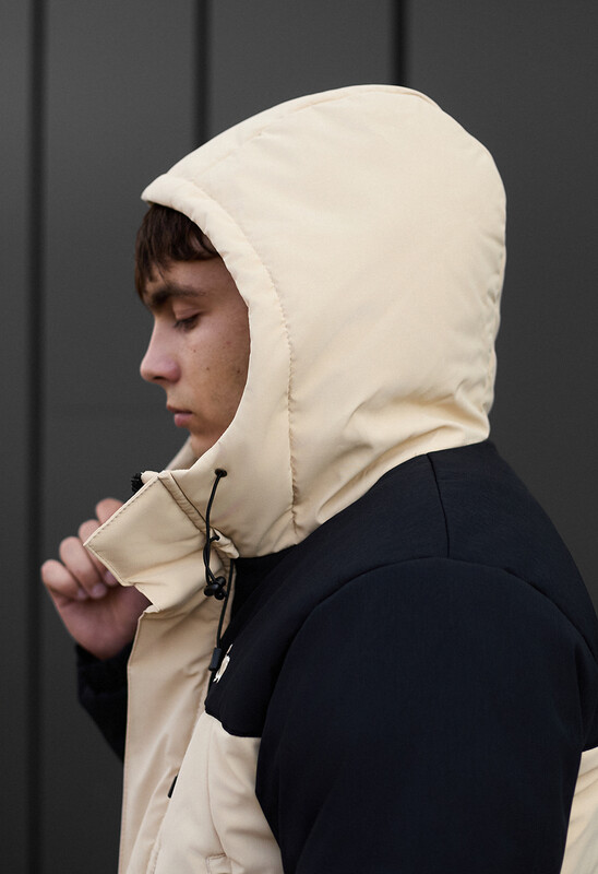 - висока горловина переходить у капюшон, об'єм якого допомагають регулювати шнури з пластиковими фіксаторами;
