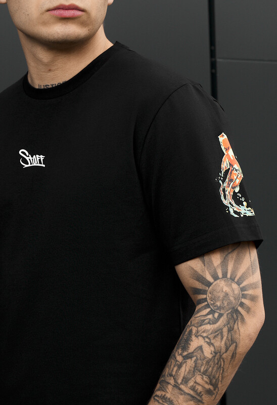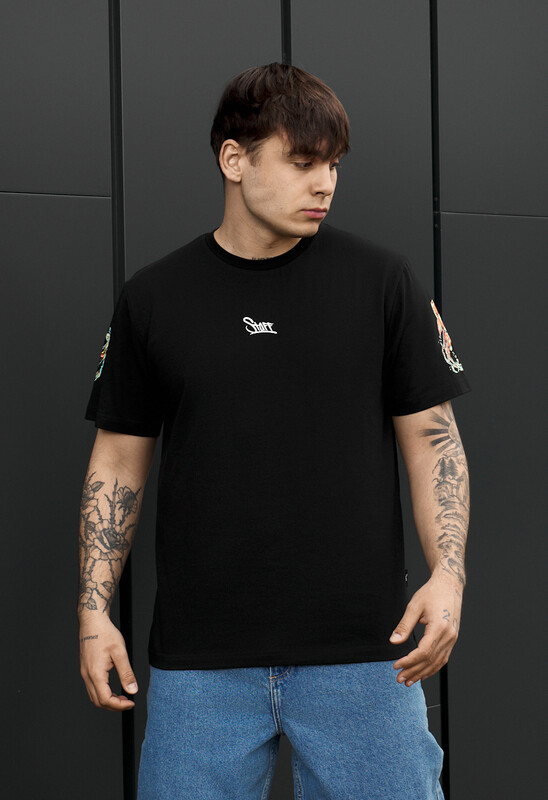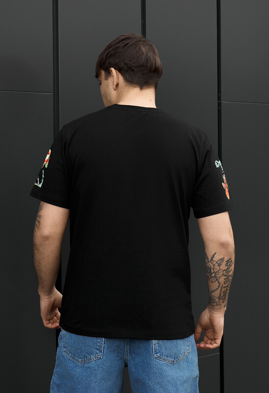 Стильная черная футболка с оригинальным принтом на рукавах станет акцентом в повседневном гардеробе. Выполнена из качественной ткани: 90% хлопок и 10% эластан, обеспечивает комфорт, дыхательность и легкую эластичность. Классический крой и круглый вырез гарантируют универсальную посадку. Идеально подходит для любого сезона. Фирменная бирка в боковом шве и логотип на груди подчеркивает подлинность и внимание к деталям. Подходит для городского стиля и casual образов.