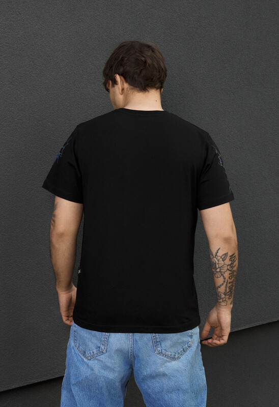Стильная черная футболка - идеальный выбор для повседневного гардероба. Изготовлена из 90% хлопка и 10% эластана, она обеспечивает комфорт, мягкость и эластичность. Классический крой и круглый вырез гарантируют удобную посадку, а качественный принт придает уникальный характер образа. Бирка с фирменным логотипом вшита в боковой шов. Подходит для любого сезона и легко сочетается с разными стилями одежды.