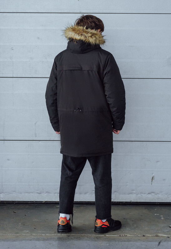 Зимняя парка обладает высокой степенью теплоизоляции, хорошо держит форму и не впитывает влагу. Большая тракторная молния с удобным замком позволяет легко расстегнуть куртку, а стяжка на спине защищает от сильного ветра. Каждый прорезной нагрудный карман на флисе разделён на две секции, что помогает подобрать самое комфортное положение для рук.