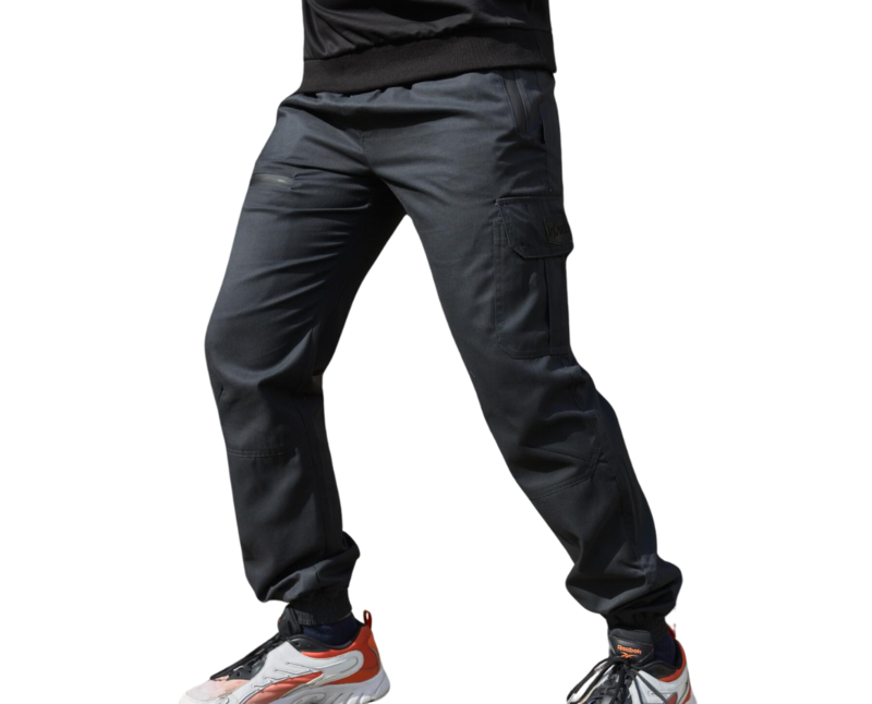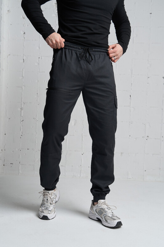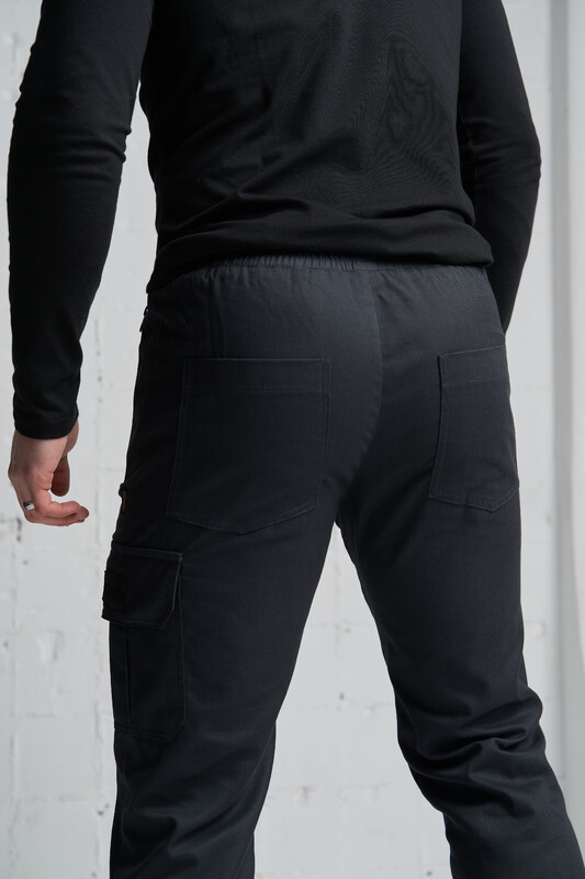В поясе регулируются при помощи резинки и шнурка. Два прорезных боковых кармана на молнии и накладной карман на липучке. Внизу манжеты на резинке
