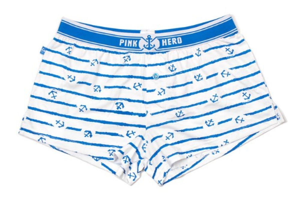 Морской рисунок, с мелкими якорями по белому фону и крупному на резинке, придает изделию особый шик.