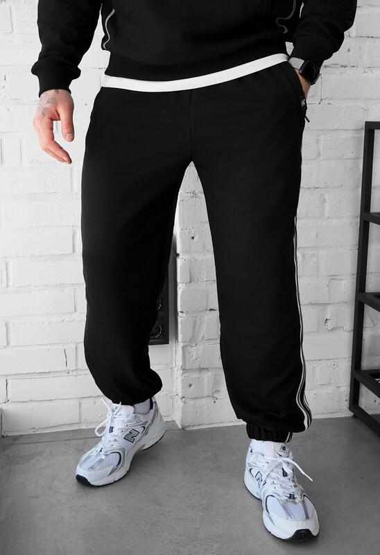 Черные спортивные штаны из 100% европейского хлопка – универсальный вариант для ежедневного комфорта в любой сезон. Модель имеет эластичный пояс в рубчике со шнурком, что обеспечивает идеальную посадку. Два прорезных кармана на молнии спереди и один накладной сзади добавляют практичности. Манжеты снизу на резинке создают силуэт. Мягкая ткань приятна для тела и хорошо держит форму, а фирменная бирка подчеркивает оригинальность изделия.