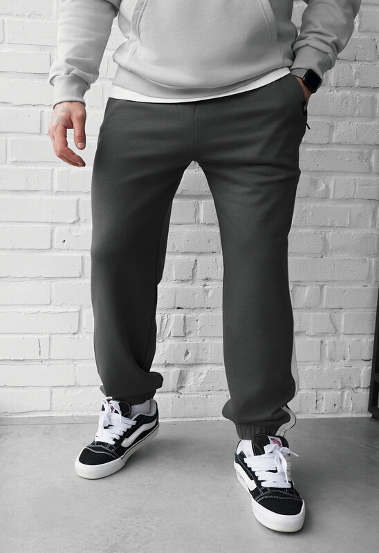Темно-серые спортивные штаны jogger из 100% европейского хлопка – универсальный вариант для ежедневного комфорта в любой сезон. Модель имеет эластичный пояс в рубчике со шнурком, что обеспечивает идеальную посадку. Два прорезных кармана на молнии спереди и один накладной сзади добавляют практичности. Манжеты снизу на резинке создают силуэт. Мягкая ткань приятна для тела и хорошо держит форму, а фирменная бирка подчеркивает оригинальность изделия.