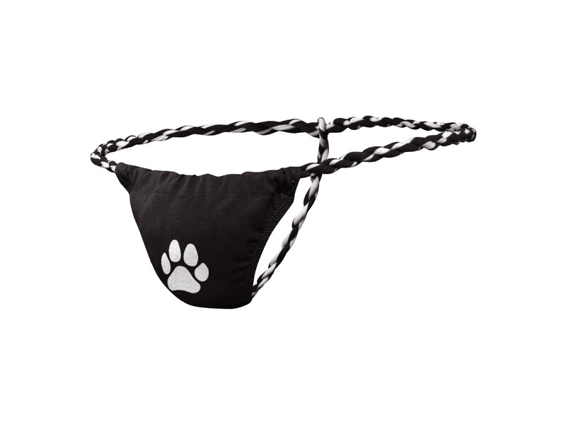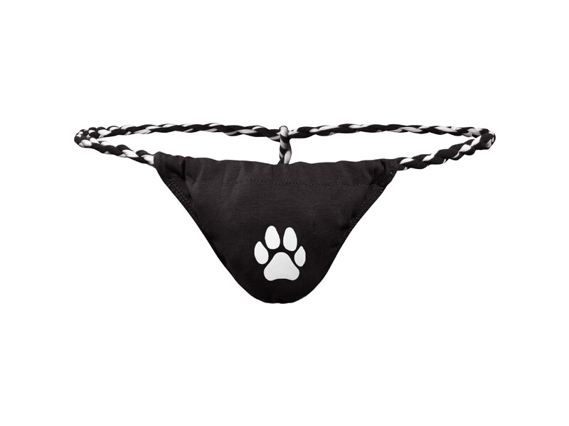 Модель построена вокруг ощущения формы и плотной посадки. Чёрный цвет подчёркивает лаконичный крой, а канатный пояс добавляет грубый природный акцент. Шнур вместо резинки выглядит честно и функционально. Хлопковая ткань со спандексом обеспечивает комфорт. Принт лапы добавляет символичности и внутреннего напряжения.