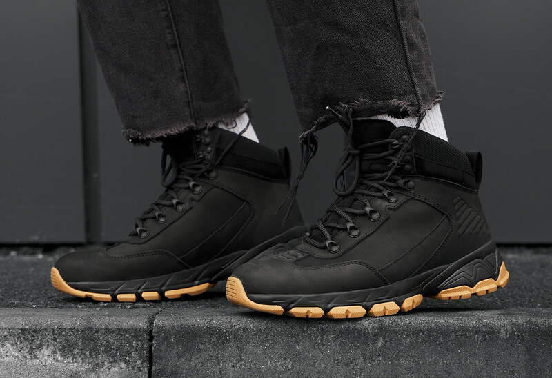 Эти высокие зимние кроссовки в глубоком чёрном цвете создают лучшие условия для передвижения в холодное время года, сочетая функциональность и стильный дизайн, что позволяет удачно экспериментировать с образами. Натуральный нубук снаружи и качественный экомех внутри обеспечивают тепло и комфорт, тогда как прочная резиновая подошва (высотой 2,5–4 см) гарантирует отличное сцепление с разными поверхностями. Модель обладает удобной посадкой, надёжно фиксирует ногу благодаря классической системе шнуровки с двумя крючками, а дополнительные вставки вокруг носка и пятки повышают износостойкость.