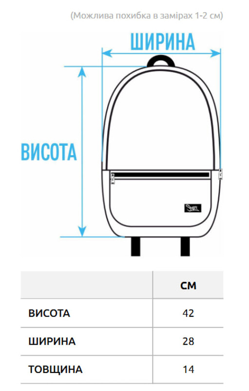 - размер: высота 42 см; ширина 28 см; ширина сбоку 14 см;
