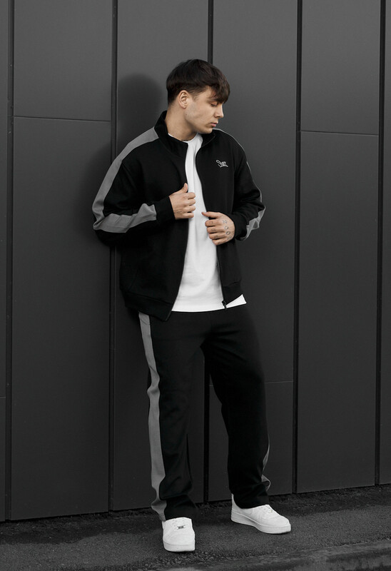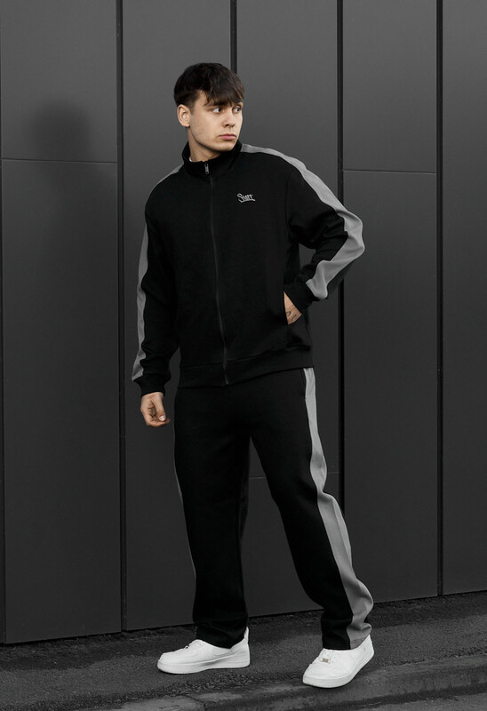 Стильный мужской спортивный костюм в черном с серыми вставками – идеальный выбор для повседневного комфорта и активного образа жизни. Изготовлен из качественной ткани (70% хлопок, 25% хлопок, 5% эластан), что обеспечивает мягкость, эластичность и износостойкость. Кофта со спущенными плечами, воротником-стойкой и молнией дополнена карманами и вышивкой. Брюки с эластичным поясом и удобной посадкой. Подходит для любого сезона.