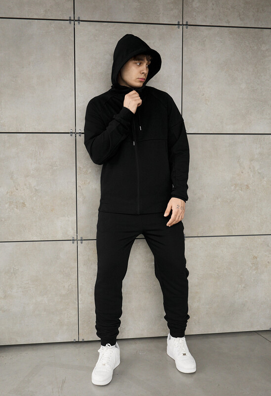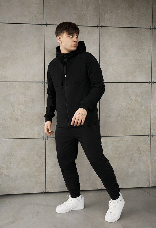 Мужской спортивный костюм черного цвета – универсальный выбор для стильного и комфортного повседневного образа. Изготовлен из 100% европейского хлопка, он обеспечивает приятные ощущения и дышащие свойства. Кофта с кроем реглан, регулируемым капюшоном и сокровенными карманами добавляет практичности. Брюки с эластичным поясом и манжетами гарантируют безупречную посадку. Идеально подходит для любого времени года.