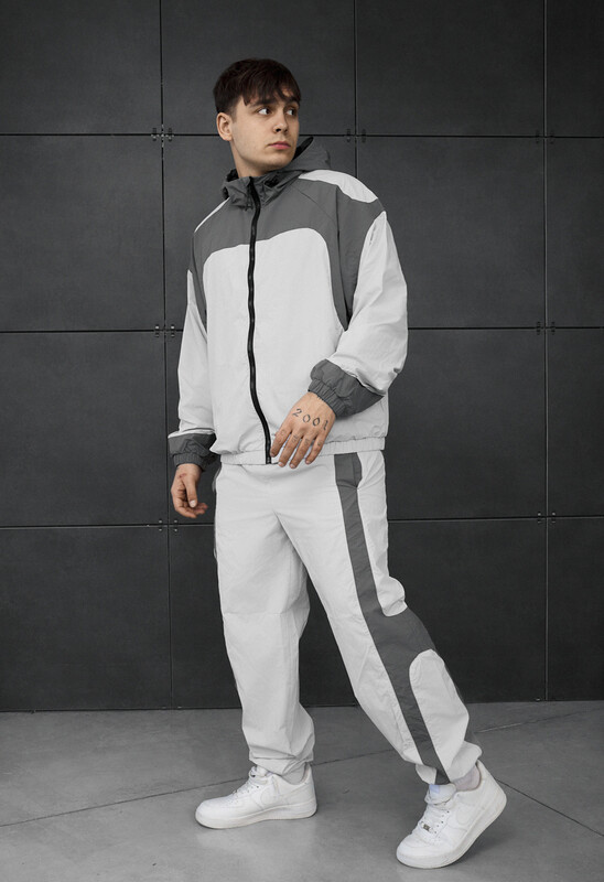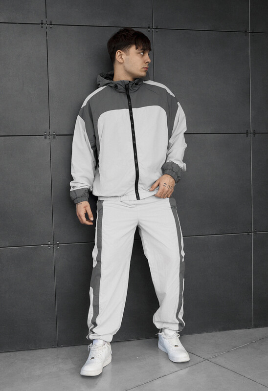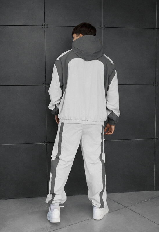 Легкий мужской спортивный костюм oversize в стильном сочетании темно- и светло-серого цвета – идеальный выбор для демисезона и лета. Выполненный из 100% полиэстера, он обеспечивает износостойкость и комфорт в повседневной носке. Куртка с капюшоном, ветрозащитной планкой, сетчатой подкладкой и скрытыми карманами на молнии. Брюки с эластичным поясом и манжетами гарантируют удобную посадку и свободу движений.