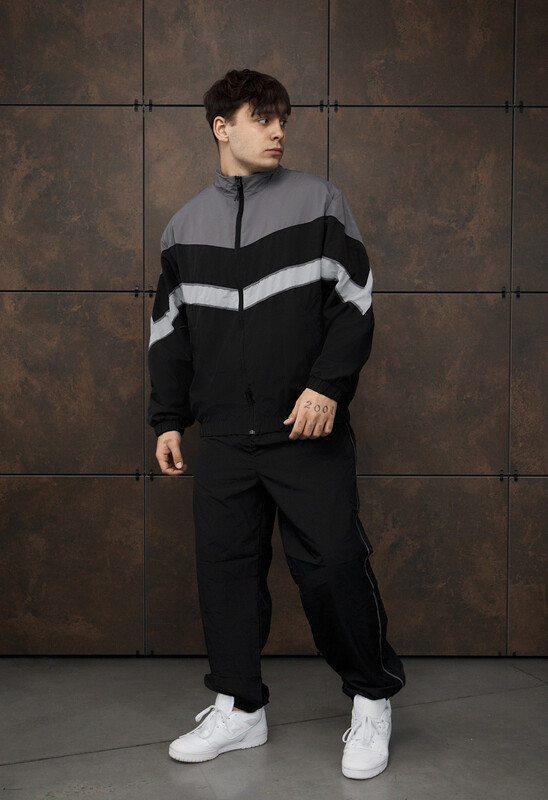 Современный мужской спортивный костюм oversize в сочетании черного и серого цветов – идеальное решение для активного стиля на каждый день. Выполненный из 100% полиэстера с сетчатой подкладкой, он обеспечивает лёгкость, вентиляцию и комфорт. Куртка с воротником-стойкой, качественной фурнитурой и карманами на молнии прибавляет практичности. Брюки с эластичным поясом и манжетами гарантируют удобную посадку и свободу движений в любой сезон.