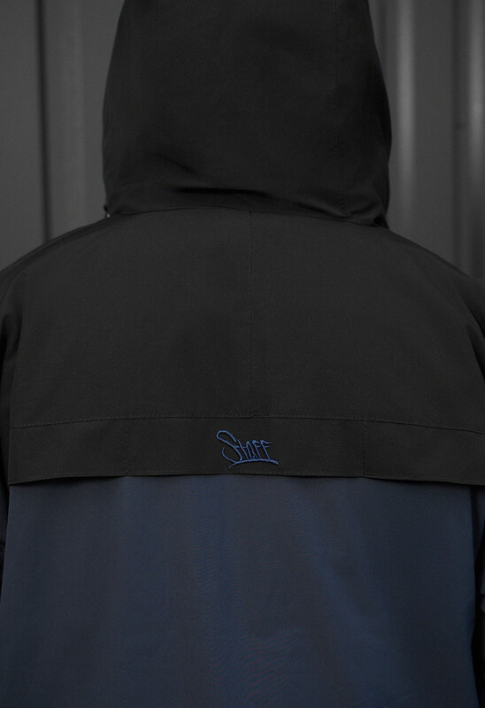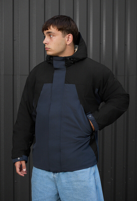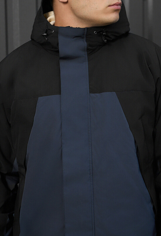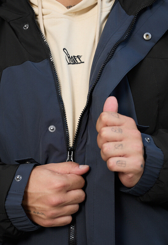 - Высокая горловина переходит в капюшон, ширина которого регулируется эластичной стяжкой с пластиковыми фиксаторами;