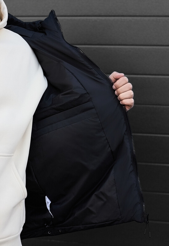 - висока горловина переходить у капюшон, об'єм якого допомагають регулювати приховані шнури з пластиковими фіксаторами;
