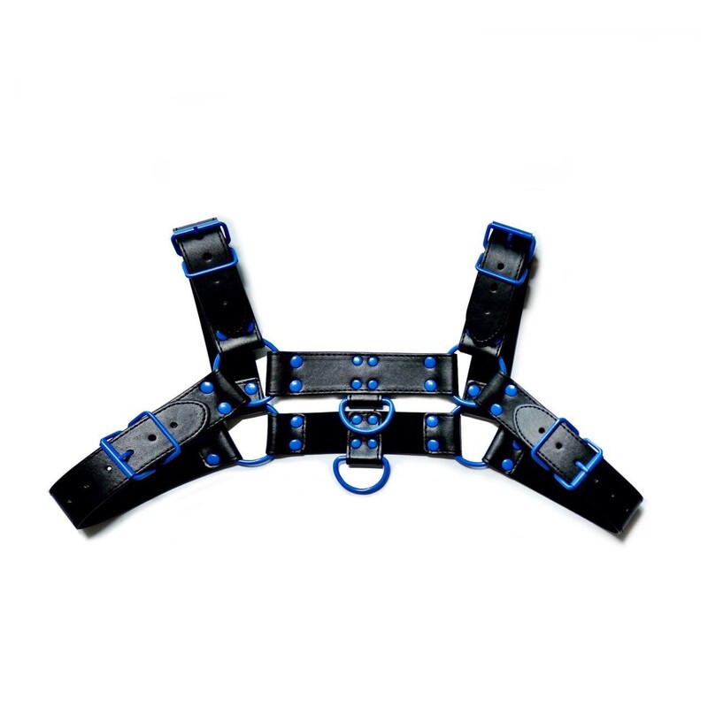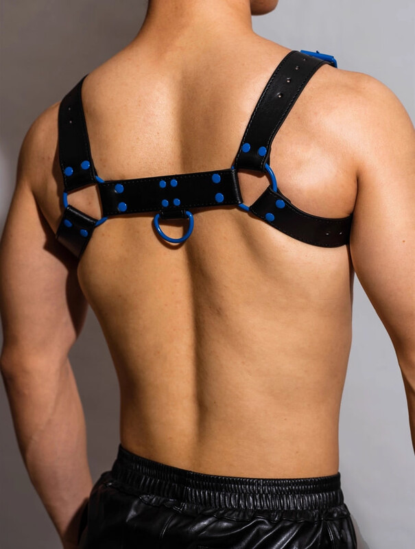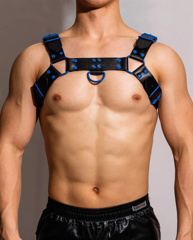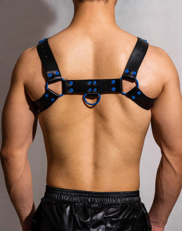 Главная визуальная особенность этой модели — контрастные синие заклепки, которые добавляют образу остроты, дерзости и яркого, нестандартного акцента. Конструкция портупеи идеально облегает тело, визуально расширяя плечи и выделяя мышцы груди и пресса. Этот сексуальный аксессуар преображает обычный образ в доминирующий и притягательный, делая его незаменимым элементом эротического белья. Портупея является символом силы и смелости, идеально подходит для тех, кто хочет добавить нотку БДСМ-эстетики в свой интимный гардероб.