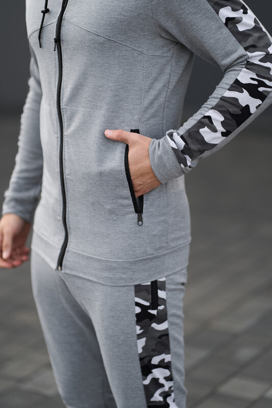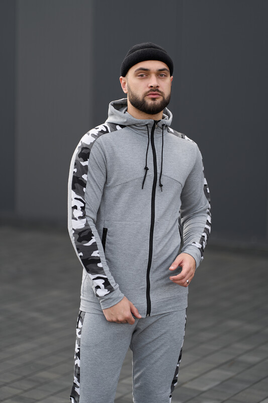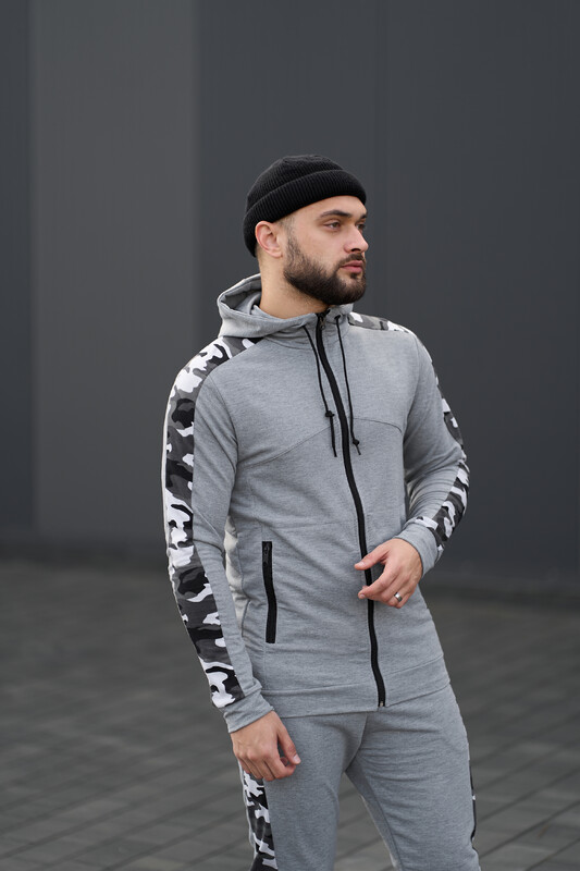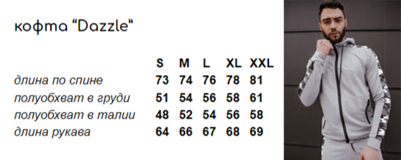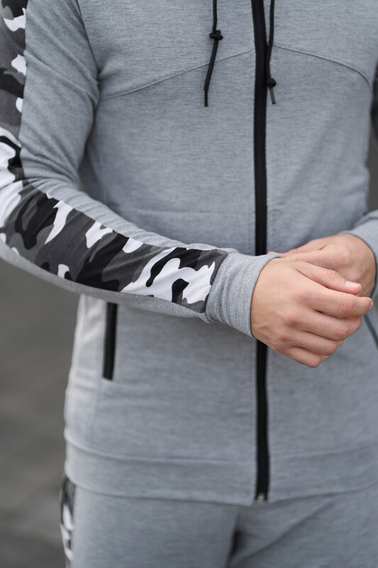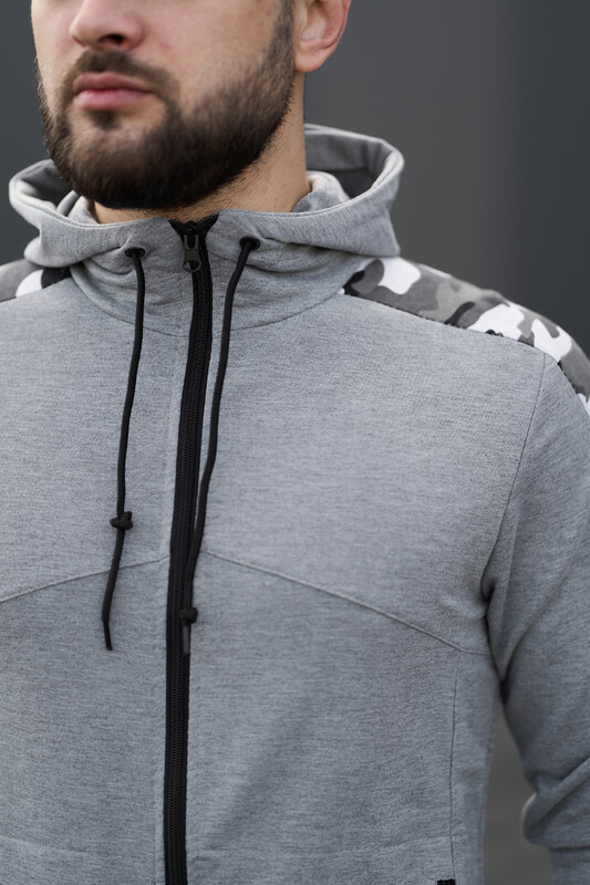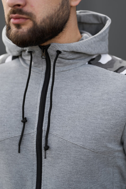Капюшон вшит, регулируется завязками. По всей длине рукава вставка из камуфлированного трикотажа.