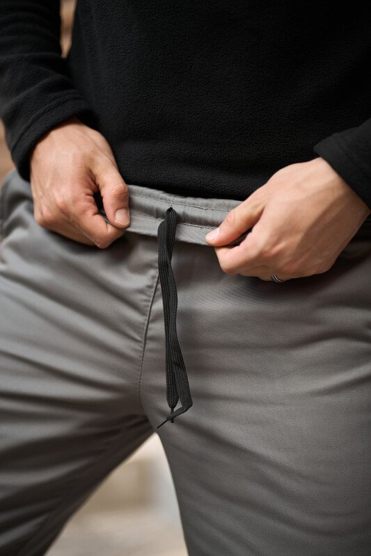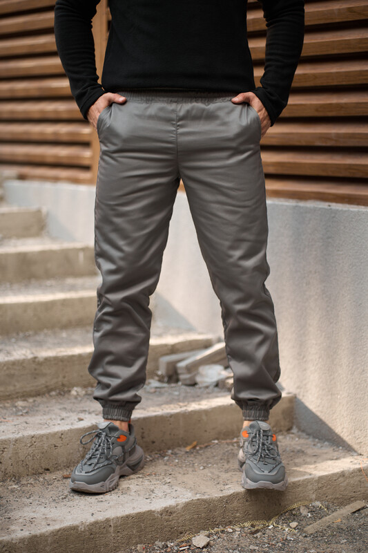 В поясе резинка и шнурок для дополнительной фиксации. Спереди два прорезных боковых кармана.
