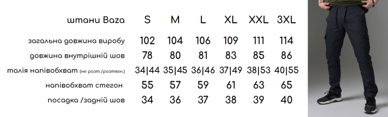2 боковых прорезных кармана, 2 накладных кармана спереди с клапаном на липучке, 2 задних накладных кармана. Имеется липучка внизу, позволяющая регулировать ширину низа штанины