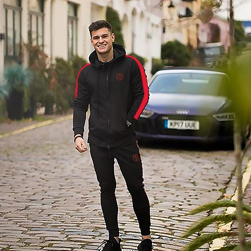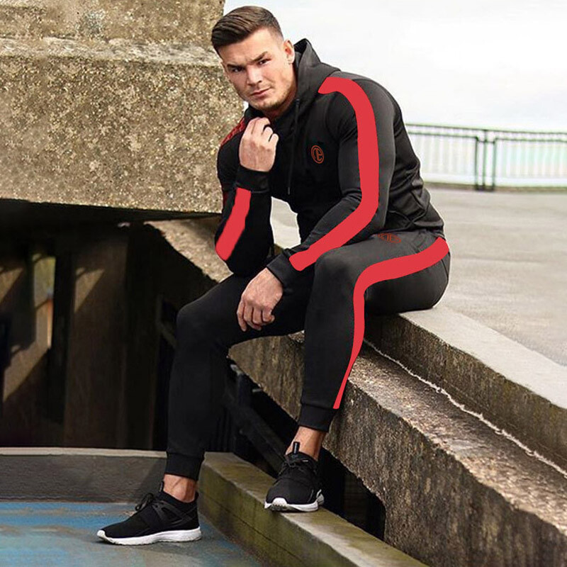 Изготовленный из эластичной ткани универсальный мужской спортивный костюм идеально подходит для спорта и отдыха, обеспечивая комфорт и свободу движения.