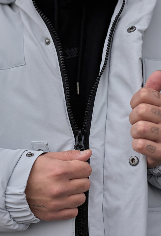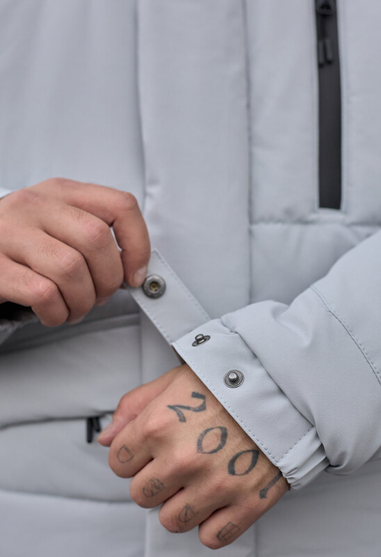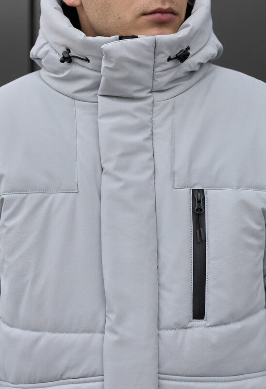 - висока горловина переходить у капюшон, об'єм якого допомагають регулювати шнури з пластиковими фіксаторами;