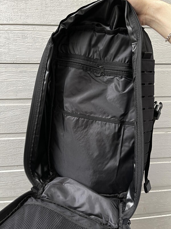 Армейский рюкзак имеет два больших отделения на молнии с различными карманами-сеткой внутри. Центральное отделение рюкзака открывается на 180 градусов. Небольшой передний карман для быстрого доступа к самому необходимому. Нижний передний карман оснащен мини-органайзером для ручек. Рюкзак также имеет встроенный отсек на липучке сзади для гидропакета.