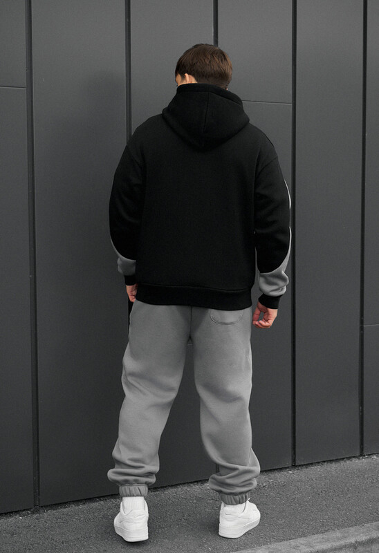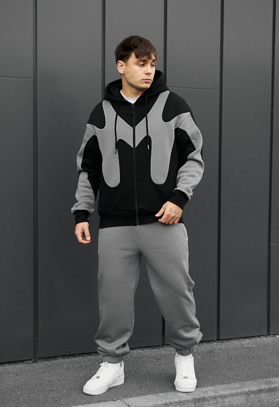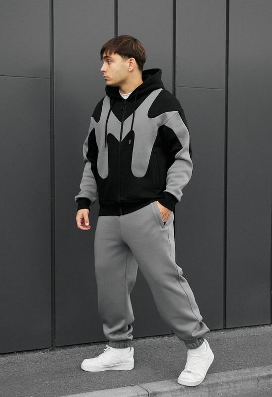 Почувствуйте сочетание стиля и надёжного тепла с этим костюмом-оверсайз в серо-чёрной гамме. Созданный для осенне-зимнего сезона, он выполнен из премиального европейского 100% хлопка, что дарит непревзойдённую мягкость, и утеплён микрофлисом, который гарантирует эффективную защиту от холода. Толстовка свободного кроя oversize застёгивается на качественную молнию, а её капюшон легко регулируется шнуром. Для удобного положения рук предусмотрено два прорезных открытых кармана, а на боковом шве размещена фирменная бирка. Брюки оснащены эластичным поясом в рубчик со шнурком для идеальной посадки. Для хранения ценных мелочей есть три кармана: два прорезных на молниях спереди, прикрытые планкой, и один накладной открытый карман сзади. Низ брюк фиксируется манжетами с эластичной резинкой.