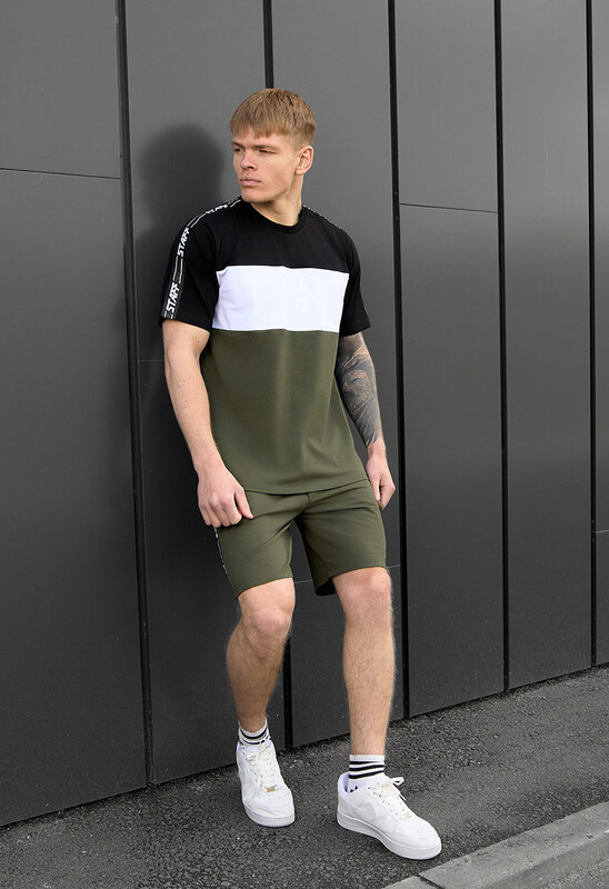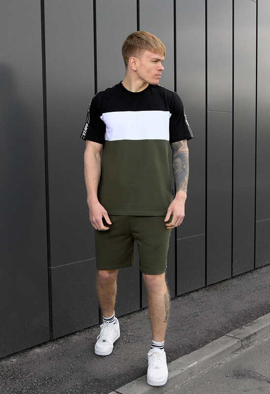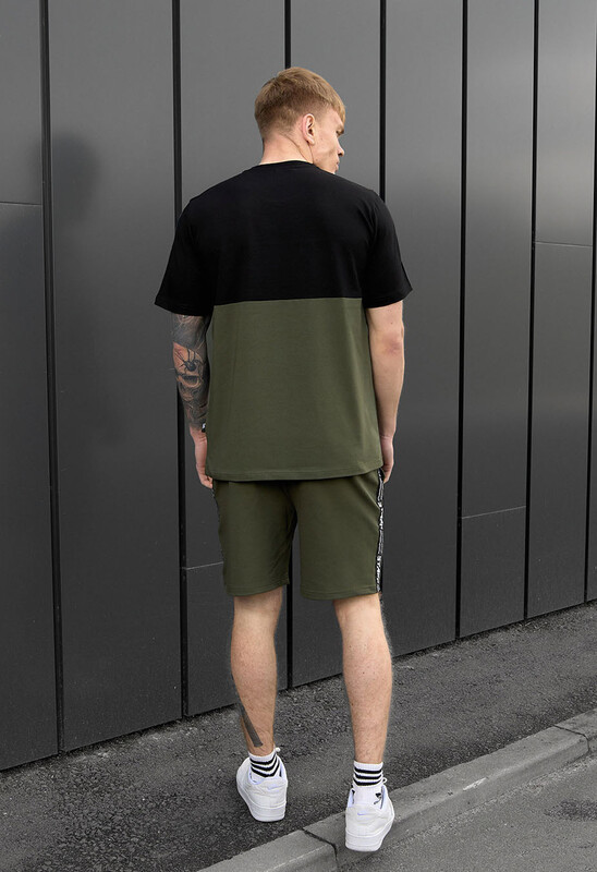 Летний комплект в яркой расцветке с атласными нашивками на шортах и футболке станет отличным вариантом для прогулки, спорта или дома.