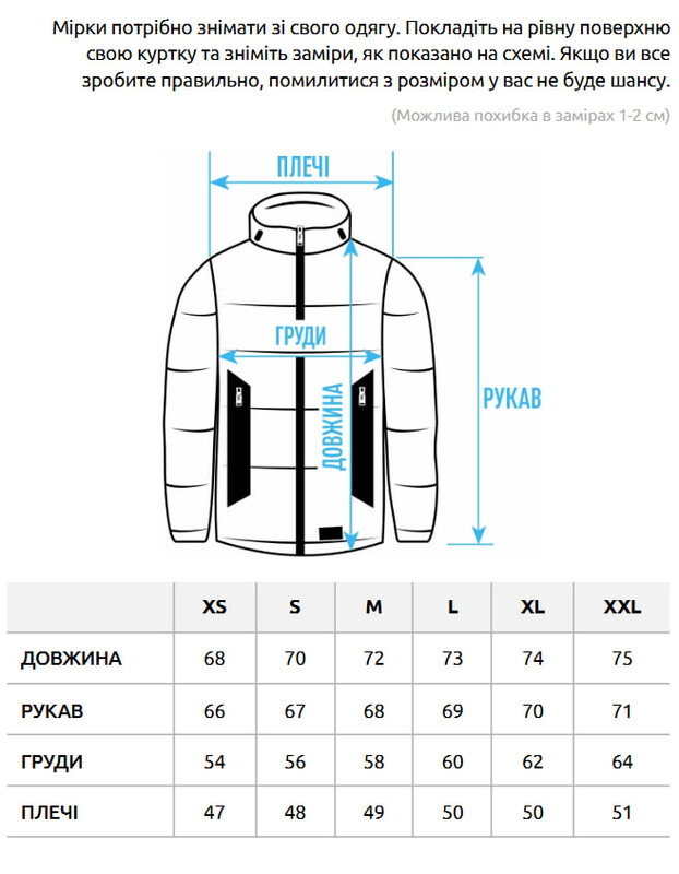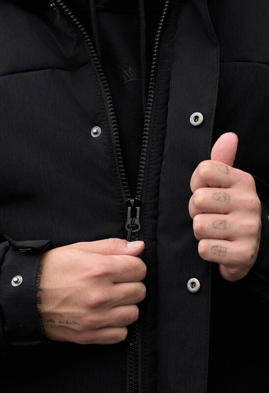 - висока горловина переходить у капюшон, об'єм якого допомагають регулювати шнури з пластиковими фіксаторами;