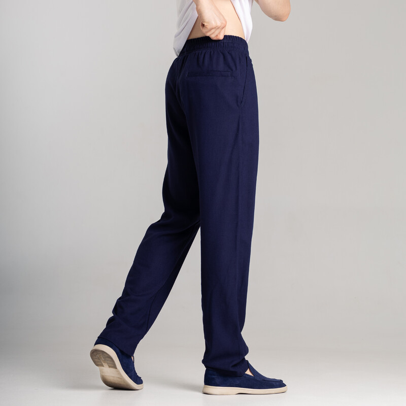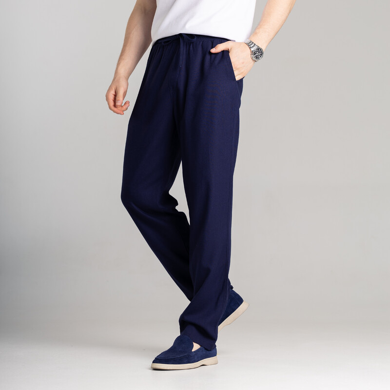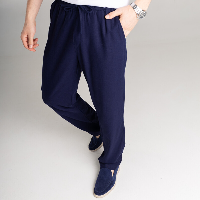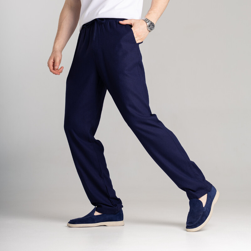 Елегантні та практичні — темно-сині лляні штани від Pobedov стануть базовим елементом літнього гардероба. Насичений синій колір підкреслює охайність образу та легко поєднується як із футболками, так і з сорочками. Повітряна тканина з льону гарантує прохолоду навіть у спеку, а вільний крій і регульований пояс роблять посадку максимально комфортною. Модель має три кишені, включно з задньою на блискавці. Ідеальний вибір для активного дня, подорожей і стильних повсякденних образів.