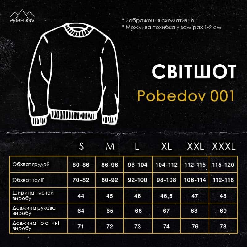 Матеріал: якісна європейська бавовна без начісу (європейський трикотаж двунитка пен'є без утеплювача). Круглий виріз горловини. Високоякісна резинка по нижньому краю та низу рукавів. Фірмова жаккардова бирка Pobedov