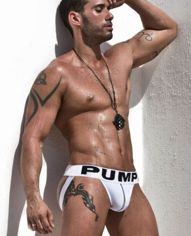 Фото - Чоловічі труси танга Pump білі з яскравою резинкою - Men box