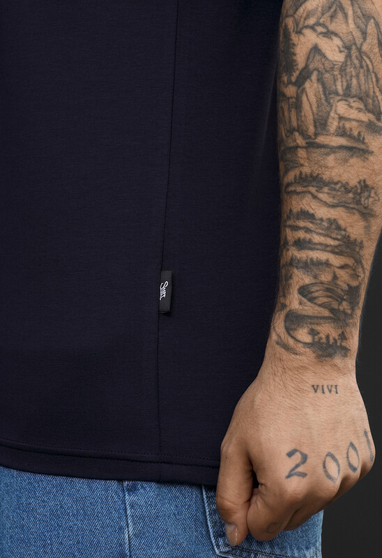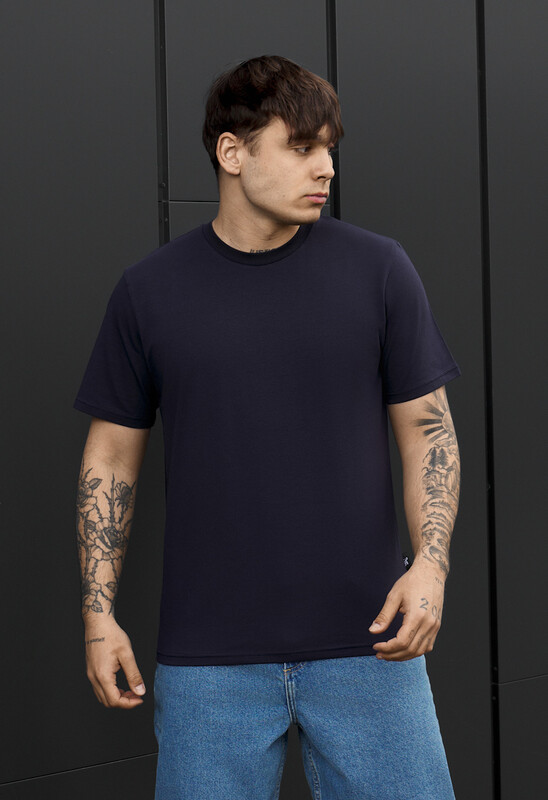 Стильна однотонна темно-синя футболка підкреслить індивідуальність образу. Виготовлена з якісної тканини: 90% бавовна та 10% еластан, вона забезпечує комфорт, м’якість і легку еластичність. Класичний крій і круглий виріз гарантують зручну посадку на кожен день. Підходить для будь-якого сезону. Фірмова бірка в бічному шві додає впізнаваності бренду. Ідеальний варіант для casual стилю та міських луків.
