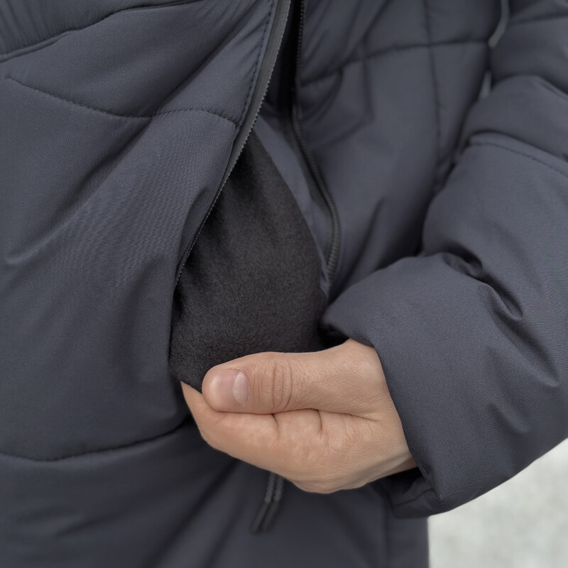 Зовнішня частина куртки виконана з водовідштовхувальної плащівки, що надійно захищає від дощу та снігу, зберігаючи сухість навіть у несприятливу погоду.