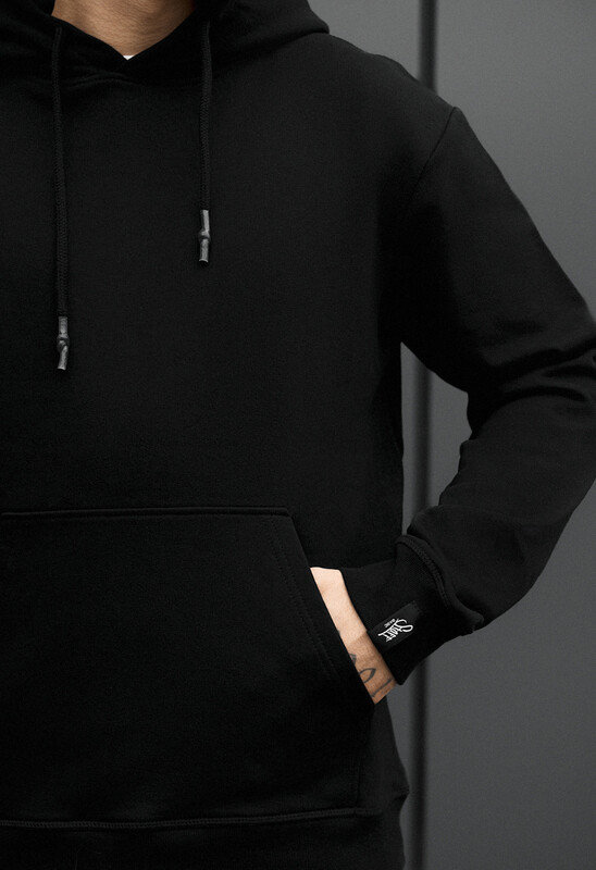 Чорне худі з 100% європейської бавовни — стильний та універсальний вибір для будь-якого сезону. Модель має крій зі спущеними плечима, що створює сучасний oversize силует і забезпечує максимальний комфорт у русі. Зручна кишеня-кенгуру додає практичності, а капюшон зі шнурком дозволяє регулювати посадку. М’яка та приємна до тіла тканина добре тримає форму. Фірмова бірка на рукаві підкреслює унікальний дизайн виробу. Ідеально для щоденного носіння.