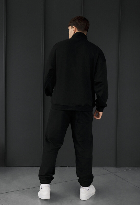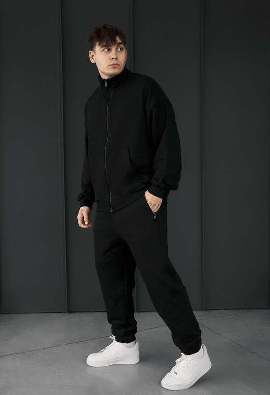 Сучасний чоловічий спортивний костюм oversize у чорному кольорі — поєднання комфорту та трендового стилю. Виконаний зі 100% європейської бавовни, він приємний до тіла та добре пропускає повітря. Кофта з високою горловиною та накладними кишенями додає практичності, а штани з еластичним поясом і манжетами забезпечують ідеальну посадку. Універсальний костюм для щоденного використання в будь-яку пору року.