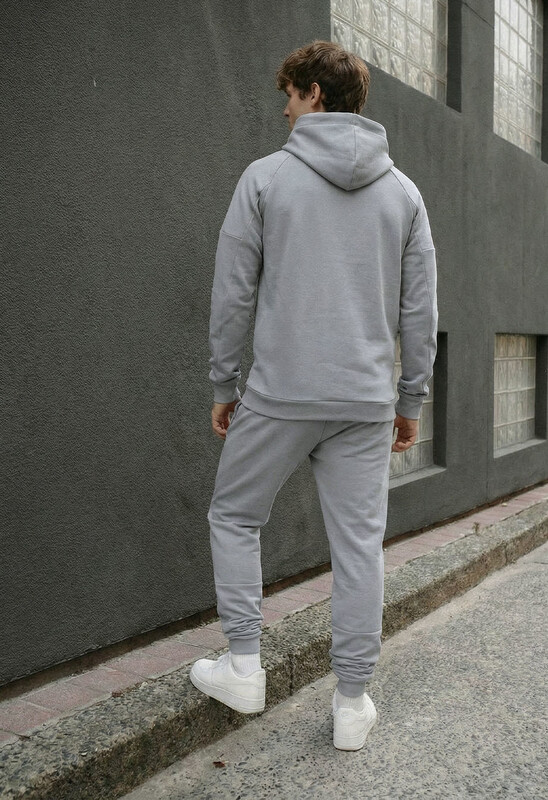 Чоловічий спортивний костюм світло-сірого кольору — універсальний вибір для стильного та комфортного повсякденного образу. Виготовлений зі 100% європейської бавовни, він забезпечує приємні відчуття та дихаючі властивості. Кофта з кроєм реглан, регульованим капюшоном і потаємними кишенями додає практичності. Штани з еластичним поясом і манжетами гарантують ідеальну посадку. Ідеально підходить для будь-якої пори року.