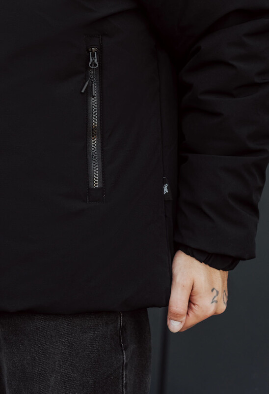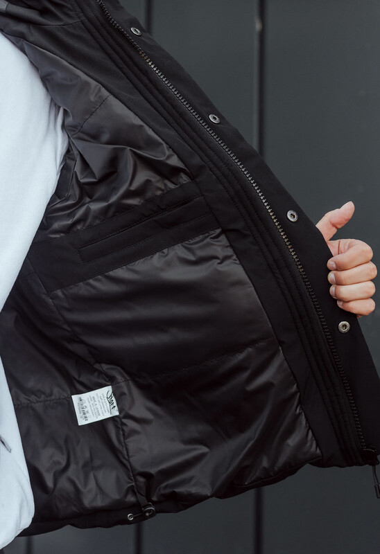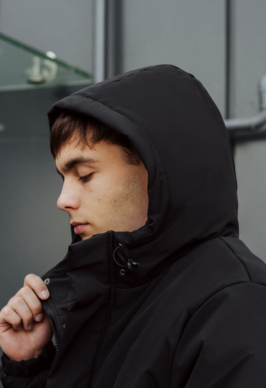 - висока горловина переходить у капюшон, об'єм якого допомагають регулювати шнури з пластиковими фіксаторами;